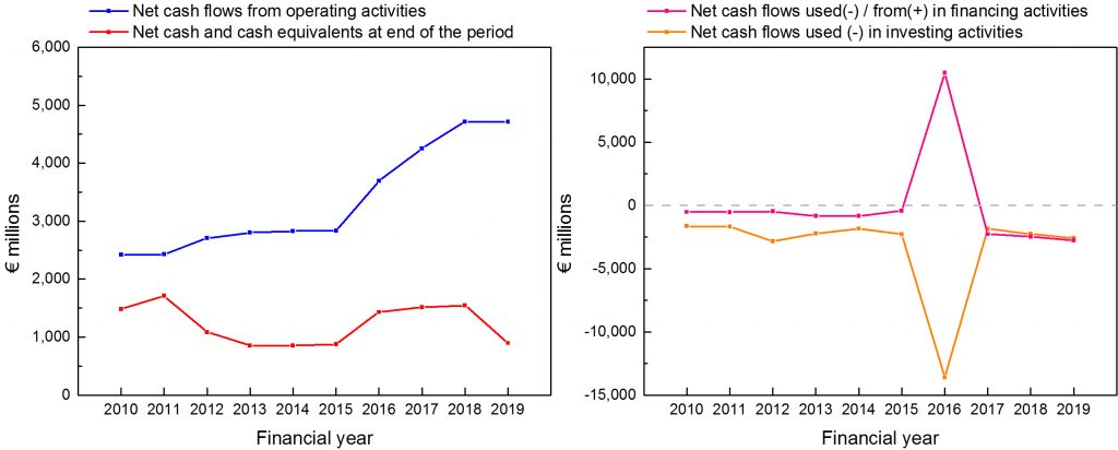 Net cash flows used in / from financing activities: shows the net flows of cash that are used to fund the company. Financing activities include transactions involving debt, equity, and dividends.[3]